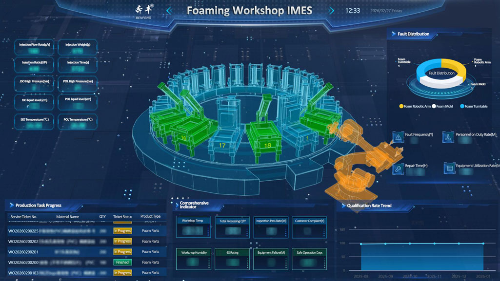 A Benfeng Seats IMES (Benfeng Seats Intelligent Manufacturing Platform) digitális mátrixán belül a habosító műhely rendkívül intelligens gyártási környezetével az üléskényelem alapvető kovácsalapjává vált.