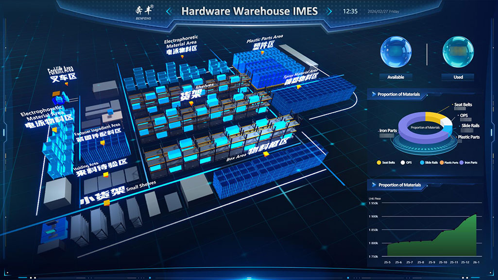 A Benfeng Seats Intelligent Manufacturing gyárának elrendezése világos, különálló funkcionális felosztásokkal, ami megkönnyíti az összes gyártási kapcsolat hatékony összehangolását.