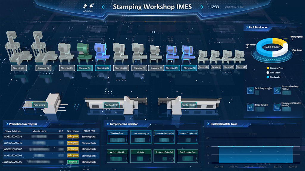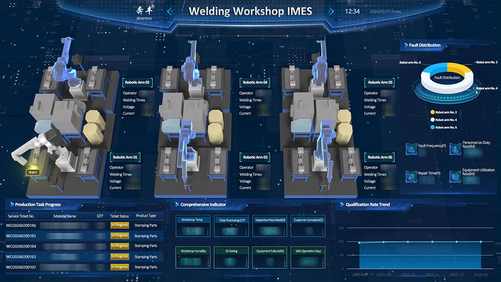 A 3D vizualizációs technológián keresztül a műhely egyértelműen bemutatja több intelligens hegesztő robotkar együttműködési működését. Minden robotkar egy dedikált kezelő- és paraméterfigyelő modullal (feszültség, áram, hegesztési számláló stb.) van felszerelve, ami precíz és szabályozható hegesztési folyamatot tesz lehetővé. Ezzel egyidejűleg valós időben figyeli az olyan kulcsfontosságú mutatókat, mint a hőmérséklet, a páratartalom és a napi hegesztési műveletek száma, biztosítva a hegesztési minőséget minden méretben, a környezettől a folyamatig.